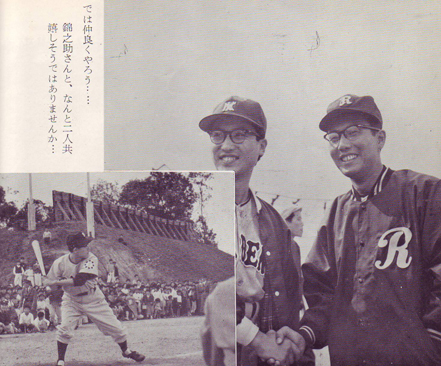 プロ野球のソレではなく、もっとキャラの立っている アクターズ(日本映画俳優協会)と コメディアンズ(関西喜劇人協会)による野球対決。試合は大阪のどこかの球場で行われた模様だ。アクターズの総監督は 東千代之介 で、市川雷蔵、北上弥太郎、中村錦之助(のちの萬屋錦之助)、大川橋蔵 らが出場。対するコメディアンズの総監督は 伴淳三郎 で、花菱アチャコ、渋谷天外、芦乃家雁玉、堺駿二 らが出場。あれ、マチャアキパパこと堺駿二は関東のイメージだけど、関西喜劇人協会だったのか?(BLOG 「高木圭介のマニア道」より)