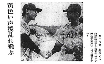 映画スターと野球といえば、本社が毎年主催する映画人オールスター野球祭を例にもちだすまでもなく、縁が深いが、伏見の京都府警察学校のグラウンドでは、午後二時から中村錦之助のゴールデンズと、市川雷蔵チームの対戦が行なわれた。東映側は月形竜之介をはじめ、吉野登洋子、五条恵子、常盤光代、吉田江梨子らの新人女優が応援すれば、大映も浦路洋子、島田竜三らが懸命の声援で、約二千人余の見物人の前で、なごやかなうちにも熱戦が繰展げられた。