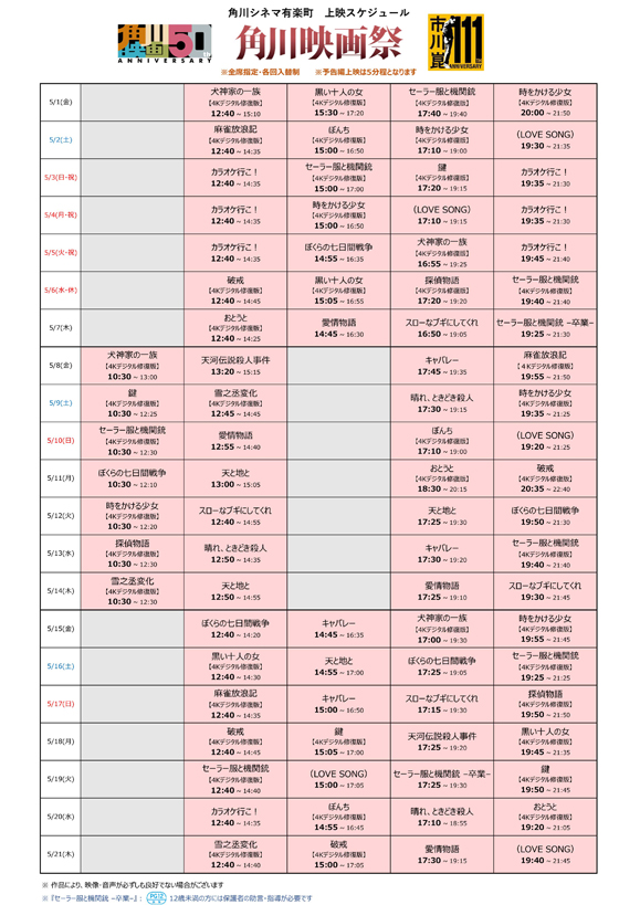 また、角川シネマコレクションの特長の一つである、4Kデジタル修復版<初披露>作品を含め、多数ラインナップ致しました。撮影監督、タイミングなど撮影当時の関係者の監修のもと、最新技術を駆使して制作した美しく、迫力溢れる映像を、ぜひスクリーンでお楽しみください。