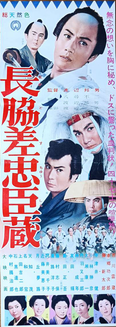 ■ 作品解説 ■ この映画『長脇差忠臣蔵』は、いわば「忠臣蔵」のやくざ版ともいうべき作で、「忠臣蔵」でみられるいろいろなエピソードをやくざの世界におき変えて描こうというもので、やくざ映画の痛快さと忠臣蔵の壮烈さが一つになって、興味百倍といった娯楽時代劇巨篇。 内容は、遠州掛川の宿の縄張りを預かる次郎吉親分(宇津井健)が、権勢を笠に着るときの老中本多備前守(名和宏)に反抗して町民を庇ったことから殺されてしまう。そこで掛川一家の大黒柱と頼む堀の内喜三郎(市川雷蔵)が親分の仇とばかり老中を狙うが、相手は飛ぶ鳥を落とす勢いの天下の老中、そのうち逆に弾圧の命が下り、一家は離散の憂目をきる。が、その老中も時勢の流れには抗し難く、野に下ったところを、大前田英五郎(勝新太郎)有栖川宮(本郷功次郎)清水次郎長(島田正吾)らの救けを得て、無事討入り、晴れて大願を成就するといったもの。 キャストは、市川雷蔵、勝新太郎、本郷功次郎、宇津井健、小林勝彦といった大映が誇る男性軍に加え、『破戒』『鯨神』などで早くも本年の新人賞にマークされている、新スタア藤村志保のほか、月丘夢路、浦路洋子、近藤美恵子、阿井美千子といったヴェテランスタアがズラリ顔を揃え、三十四年の『次郎長富士』以来、実に三年ぶりに見られる豪華キャストです。 スタッフは、この種の娯楽大作を作らせてはこの人の右に出るものが居ないといわれる、ヴェテランの渡辺邦男監督のメガフォン、シナリオは、本邦最初の70ミリ映画『釈迦』続く第二弾『秦・始皇帝』と、このところ70ミリずいている八尋不二が精魂かたむけての作、撮影は渡辺孝、美術太田誠一、照明伊藤貞一といった新鋭、ヴェテランがガッチリスクラムを組んでいます。(プレスシートより)