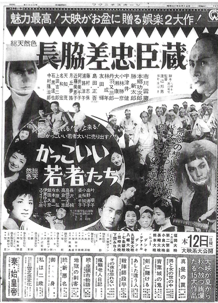 この松竹の『忠臣蔵』公開によって、現在は東映に身を置く高田浩吉や近衛十四郎が松竹のスクリーンに登場することになるわけですが、五年前の旧作が東宝の『忠臣蔵』とぶつかるとなると、松本幸四郎、染五郎父子、それに市川団子などは、両方のスクリーンに顔を出すことになり、旧作で立花左近をやっている幸四郎がこちらでは内蔵助だったり団子と染五郎は両方のスクリーンで同じ役だったりで、とんだ騒ぎになりそう。(映画情報62年10月号より)