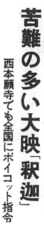 西本願寺は、二十三日武田達誓宗務総長の名で全国三十一教区長あてに、『釈迦』のストーリーは"史実をまげて釈尊の尊厳を傷つけ、仏教徒を侮辱している"ので、同映画に協力しないよう指令した。また全日本仏教会(会長西本願寺大谷光照門主)も、近日中に常務理事会を開いて対策をきめる。