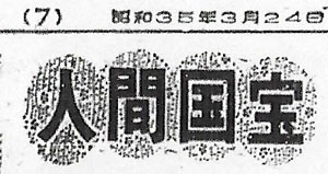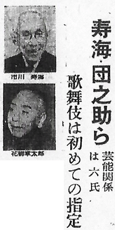 文化財保護委員会の専門審議会第四分科会(芸能・工芸部門、久保田万太郎会長)は二十三日、重要無形文化財の保持者としてカブキ俳優市川寿海、市川団之助ら芸能関係六人を含む八人を新たに指定することを決めた。正式には二十五日の同保護委員会定例委員会で決定する。カブキ俳優の“人間国宝”はこんどが初めて。また、ワキ役で地味な道をあゆんできた団之助指定は注目される。