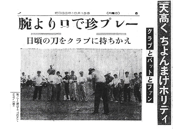参加したのは伊沢一郎、宮坊太郎、河津清三郎、田崎潤、名和宏、小堀明男、小笠原省吾、北上弥太郎、堺俊二らで、あとから紅一点伊吹友木子がはせ参じたが、松竹の御大高田浩吉も昼前に顔をみせ、文字どおりはじめて握るクラブで、たちまし指の皮をむいた。