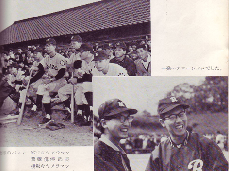 映画スターと野球といえば、本社が毎年主催する映画人オールスター野球祭を例にもちだすまでもなく、縁が深いが、伏見の京都府警察学校のグラウンドでは、午後二時から中村錦之助のゴールデンズと、市川雷蔵チームの対戦が行なわれた。東映側は月形竜之介をはじめ、吉野登洋子、五条恵子、常盤光代、吉田江梨子らの新人女優が応援すれば、大映も浦路洋子、島田竜三らが懸命の声援で、約二千人余の見物人の前で、なごやかなうちにも熱戦が繰展げられた。