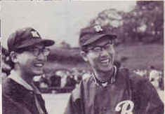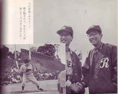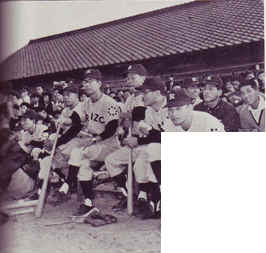 我軍のベンチ。雷蔵さんの右隣から相坂キャメラマン、斎藤俳優部長、宮川キャメラマン