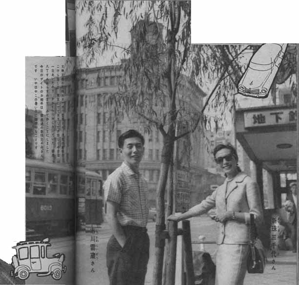 大映京都の若様スタア市川雷蔵さん、浅草の劇場のこけら落しで東京にでてきましたが、珍しく今日は一日あいたので、かねてウワサにきいていた。銀座八丁をすみからすみまで歩くことにしました。