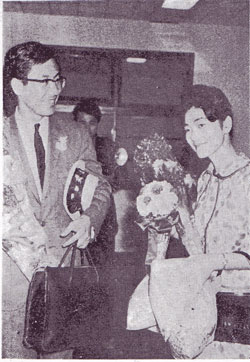 アメリカみやげのシナトラ・ハットをこわきに帰国した市川雷蔵夫妻