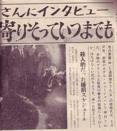 結婚式は午後3時から、赤坂のホテル・ニュージャパン3階の結婚式場で行われた。出席者は、媒酌人の藤山勝彦氏夫妻、雷蔵の父の市川寿海、永田雅一大映社長夫妻、恭子さんの母遠田光子さんら、近親者ばかり18名。報道関係者はおひざもとの大映カメラマンさえもシャットアウトという厳重さだ。