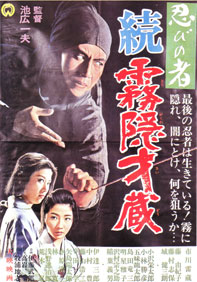 忍びの者 続・霧隠才蔵 1964年大映92分モノクロ 〜大阪落城後、才蔵は真田幸村とともに種子島へと落ち延びる。しかし、服部半蔵らに発見され、観念した幸村は自ら命を絶つ。復讐を誓った才蔵は単身駿府へと潜入する…。孤独な忍者のむなしい戦いを描いた『忍びの者』シリーズ第5作。〜