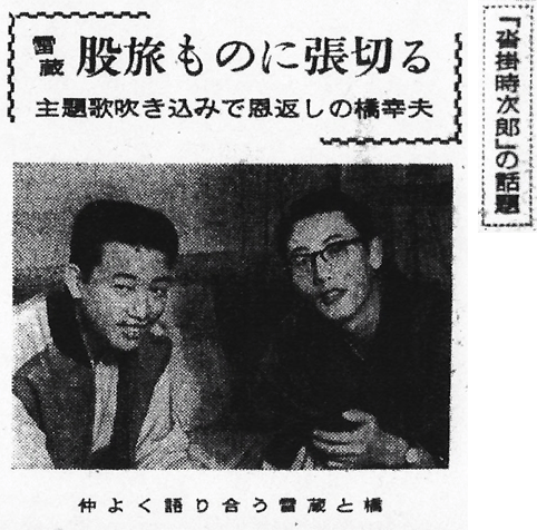 市川雷蔵が新珠三千代と初コンビを組んで、久方ぶりに本格的股旅映画『沓掛時次郎』への出演が決定した。最近は"濡れ髪シリーズ"で代表されるコミカルな股旅物が多かったが、こんどはガラリと趣向を変えて、哀切胸をうつ感動のやくざ映画にさっそう無類の活躍をすることになっている。 一宿一飯のやくざの義理から助っ人を買ってでた沓掛時次郎は、六つ田の三蔵に一太刀浴びせる。だがそれが悪貸元溜田の助五郎のワナとはしらなかった。 長谷川伸の傑作として知られている原作に宇野正夫、松村正温が共同脚色で、スリルとサスペンスに富んだ力強いアクションと、時次郎とおきぬの愛と憎しみの人間ドラマを、現代人の共感を呼ぶように構成、監督には新人池広一夫が当たる。久しぶりの本格的な股旅映画に、意欲をみせる雷蔵のこの作品の決定を知った橋幸夫は、兄貴分のためにと、彼得意の魅力にみちた股旅ソングを主題歌として吹き込むことになって、東京から激励にかけつけた。この橋の友情に雷蔵も大よろこび。気の合った二人が顔を合せて、話がつぎつぎとはずんでゆく。 雷蔵 こんどは主題歌を入れてくれることにきまったし、吉田正さんにいい曲を作ってもらってくださいよ。『沓掛時次郎』といえば股旅物の傑作として、今まで映画に何度となく作られているし、舞台でも多くの先輩がやっていられる。それだけにぼくとしてもやりがいがあるわけだ。こういう作品は君の歌のジャンルのものだし、張りきって吹き込んでくれよ。 橋 先日のバースデー・ショーに、わざわざ東京まできていただいてありがとうございました。『おけさ唄えば』の時にはいろいろおせわになりました。僕もこんどは『磯ぶし源太』の主演がきまっています。機会があれば、もう一度映画で共演したいものです。『潮来笠』、『木曽ぶし三度笠』、『おけさ唄えば』、『喧嘩富士』と四本の映画に出演してきましたが、ちょうどおもしろくなってきたところですよ。『沓掛時次郎』も主題歌だけで残念ですが、雷蔵さんの演技をよくみせていただいて、こんごの参考にしたいと思います。いい映画にしてくださいよ。(西スポ 06/05/61) |
